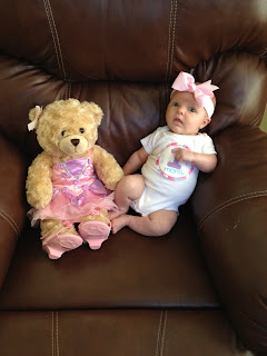 The bear will appear in all of her monthly pictures. It's the one David made for Molley on the day she was born. Notice the shoes. David told my mom that girls like shoes. Ha!